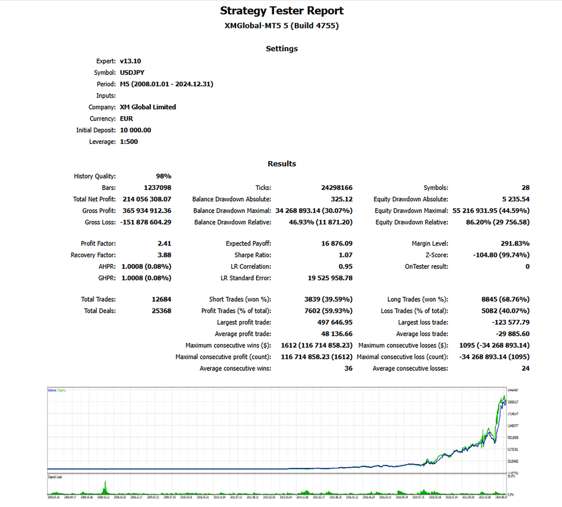Detailed MT5 Strategy Tester results including equity curve, trade statistics, and risk metrics for the selected configuration.
